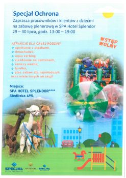29-30 lipca 2023 w godzinach 13:00-19:00 zapraszamy pracowników i klientów z dziećmi na zabawę plenerową w Hotelu Splendor. Przewidzieliśmy atrakcje dla całych rodzin m.in. spotkanie z alpakami, dmuchańce, aqua zorbing, zjeżdżanie na pontonach, rowery wodne, tyrolkę oraz wiele innych atrakcji. Adres SPA Hotel Splendor ****, Siedliska 495.